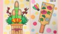 「羽根つき」は、背景にカラフルな丸模様を描き足し、少し華やかな雰囲気に仕上げています。