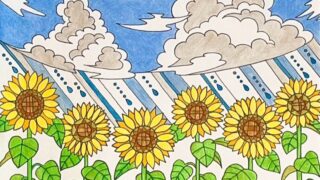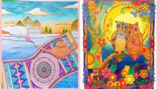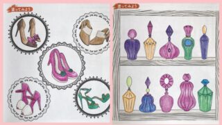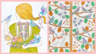 人気のEriyさんに気軽に挑戦できるポストカードサイズの塗り絵本『夢見る部屋の16人POSTCARD塗り絵ブック』から、ファーバーカステル「ポリクロモス」で塗った「203号室 シャーロット」のページをご紹介しています。